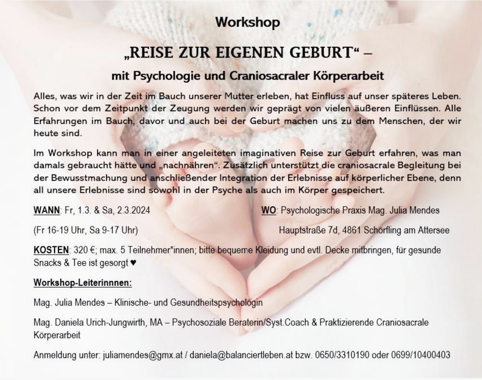 Im Workshop kann man mit einer angeleiteten imaginativen Reise zur Geburt erfahren, was man damals gebraucht hätte und nachnähren. Zusätzlich unterstützt die craniosacrale Begleitung bei der Bewusstmachung und anschließender Integration der Erlebnisse auf körperlicher Ebene.